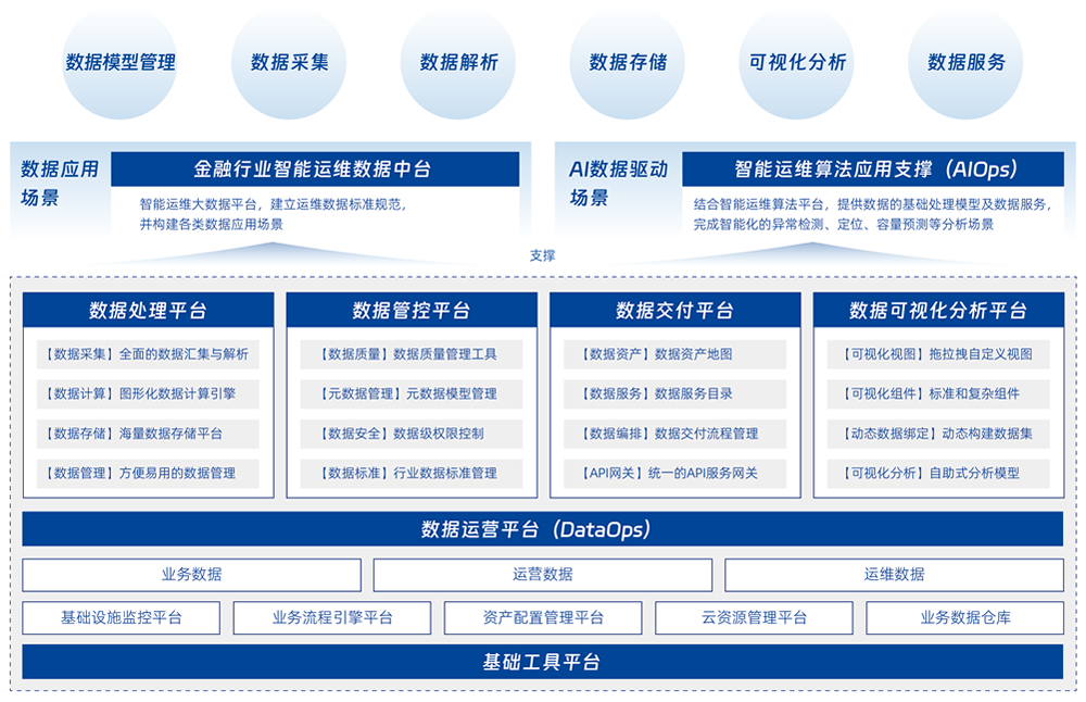 通过平台整合各种运维工具的数据和服务能力,在保证数据隐私和安全的前提下,通过大数据技术等手段,来解决 IT 系统运行过程中产生的海量数据分析问题,并将分析结果通过数据共享服务提供给各类上层应用,帮助 IT 运维和管理人员全面了解系统运行状态,提升可用性。